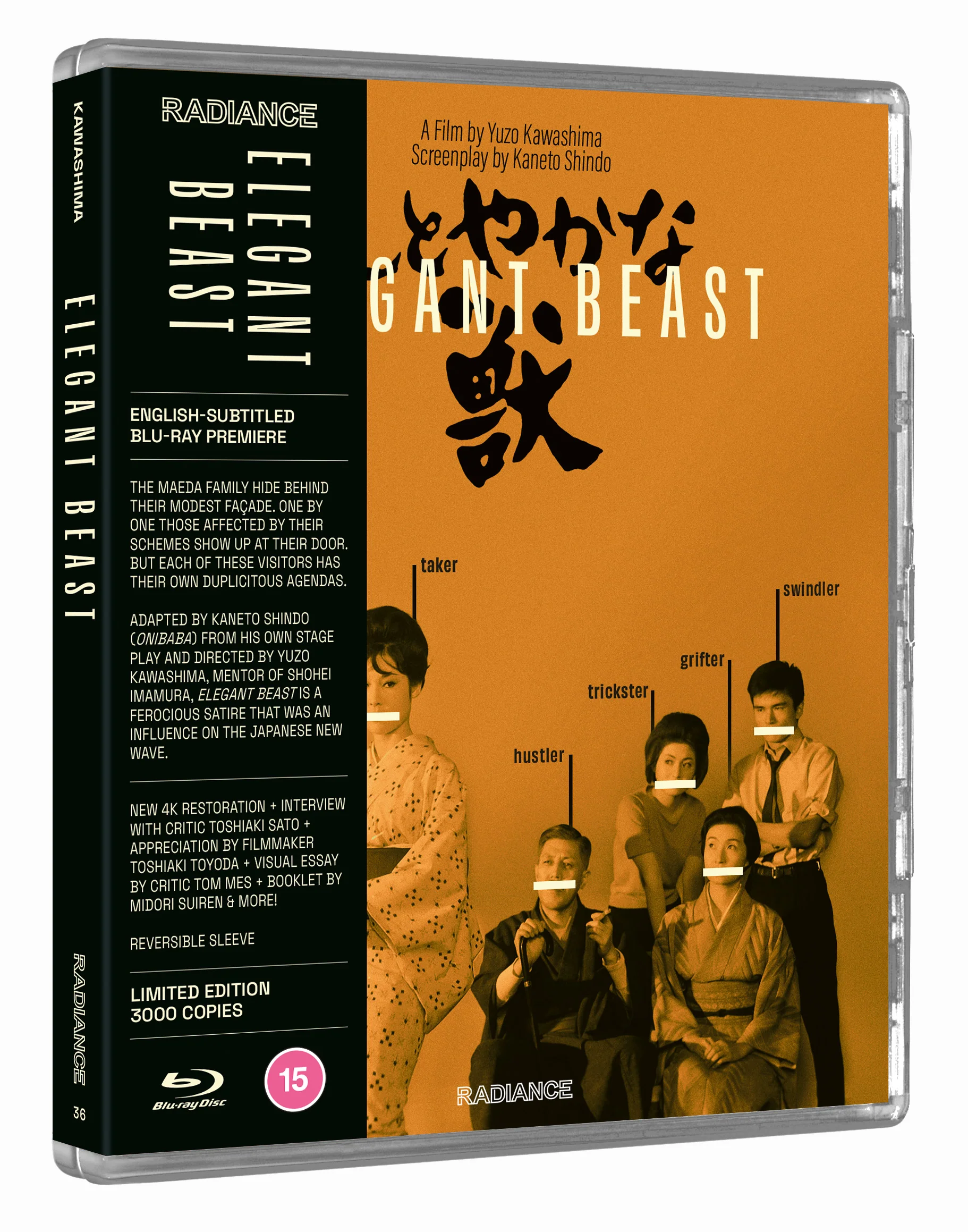 In their humble two-room apartment, the Maeda family seem ever so self-effacing - but their modest faƧade hides another truth. Daughter Tomoko is the mistress of a bestselling author with well-lined pockets. Son Minoru embezzles funds with his lover Yukie (Ayako Wakao, Red Angel), who has her own hidden agenda. And father Tokizo (Yunosuke Ito, Ikiru, Lone Wolf and Cub) is a former military man who swears he will never return to the poverty he knew during the war, no matter what the cost. One after another, those affected by the Maedasā schemes show up on their doorstep. But these visitors all have their own duplicitous agendas. With each knock on the door, the gamesmanship reaches a whole new level. Elegant Beast was adapted by Kaneto Shindo (Onibaba, Naked Island) from his own stage play. Director Yuzo Kawashima, mentor of Shohei Imamura and a major influence on the Japanese New Wave, makes magnificent widescreen use of the single apartment setting to deliver a ferocious satire on Japanās post-war economic miracle.