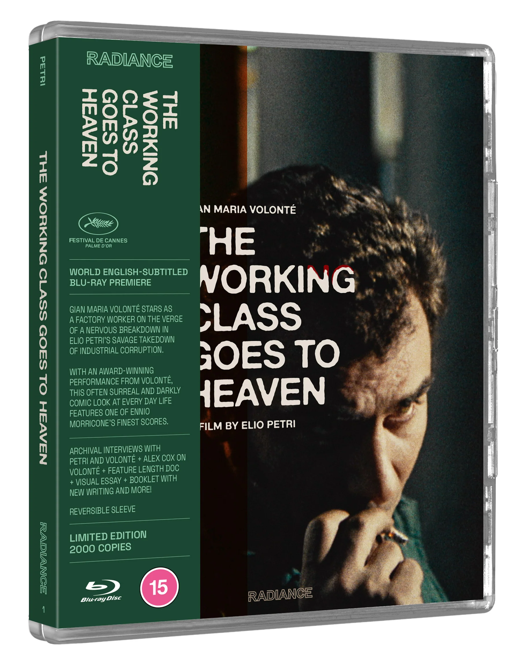 Gian Maria VolontĂ© (A Fistful of Dollars), stars in one of provocative filmmaker Elio (Investigation of a Citizen Above Suspicion) Petri's most politically charged films as factory worker Lulu: a man on the verge of a nervous breakdown. Too tired to sleep with his girlfriend, cut out of his sonâs life by his ex, humiliated and disrespected, Lulu turns revolutionary following an accident at work. The Working Class Goes to Heaven is an oftentimes surreal and darkly comic look at the life of an everyday Italian trying to find a sense of purpose in a world where he is only allowed to be a tool for industry. A savage takedown of capitalism and industrial corruption, the film was recipient of the prestigious Cannes Film Festival Palme dâOr and features a gloriously unhinged, award-winning performance from VolontĂ©, accompanied by an exceptional score by Ennio Morricone and stunning cinematography by Luigi Kuveiller (Deep Red).